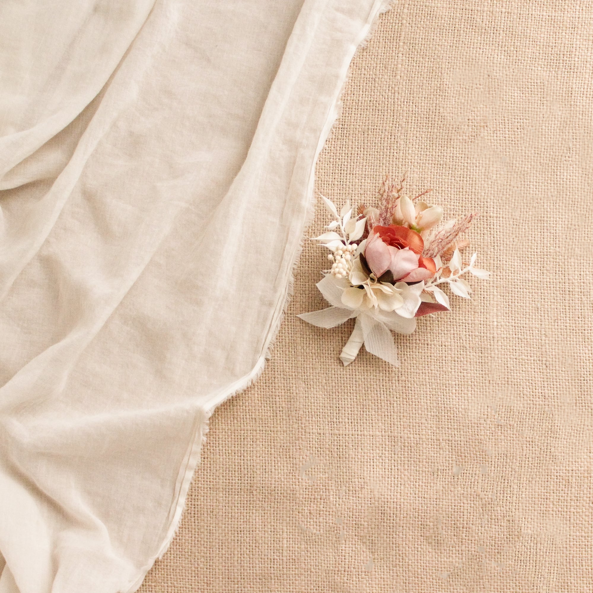 全てアーティフィシャルフラワー(造花)でお作りしている為、耐久性に優れ、ご遠方へのお持ち運びやリユースなどに安心してご利用いただけます。 ブートニア付。