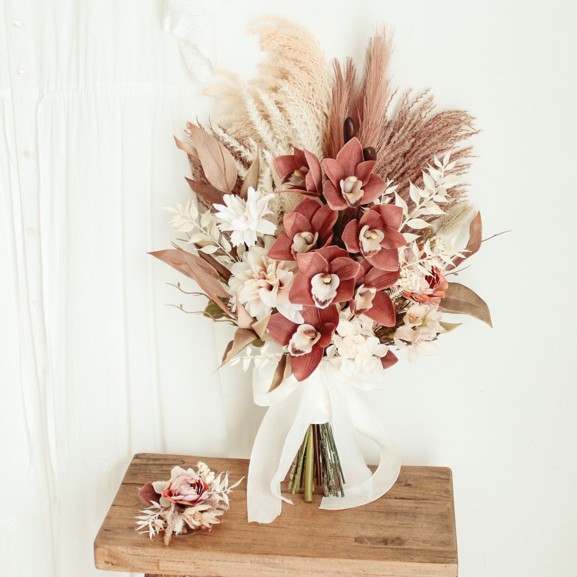 程良い華やかさやあたたかみのあるテラコッタカラーのシンビジュームに、ダリアやアジサイ、ふんわりとしたパンパスなどを添えたオータム感たっぷりのウエディングブーケ。縦に長いデザインで、ナチュラルな雰囲気に仕上げました。和装などにもオススメです。