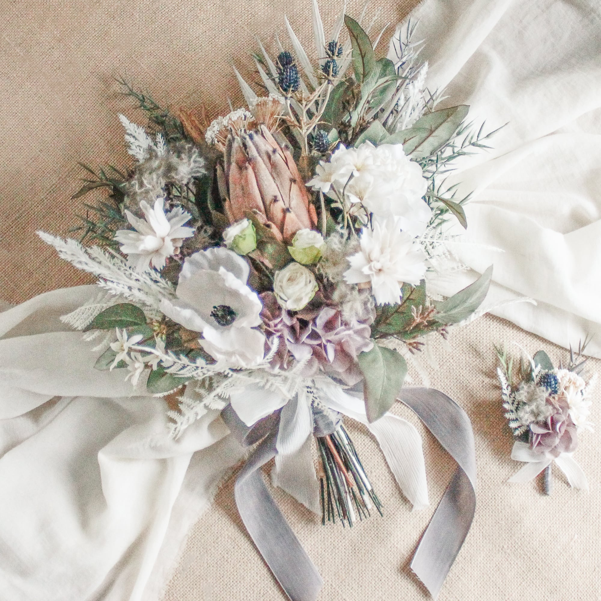 ニュアンス感たっぷりのブラウン系のプロテアに、白い芍薬やユーカリ、ライスフラワーなどのドライフラワーのようなお花をあしらって束ねたウエディングブーケ。程良いラフ感とスタイリッシュな雰囲気で花嫁さまをファッショナブルに演出します。